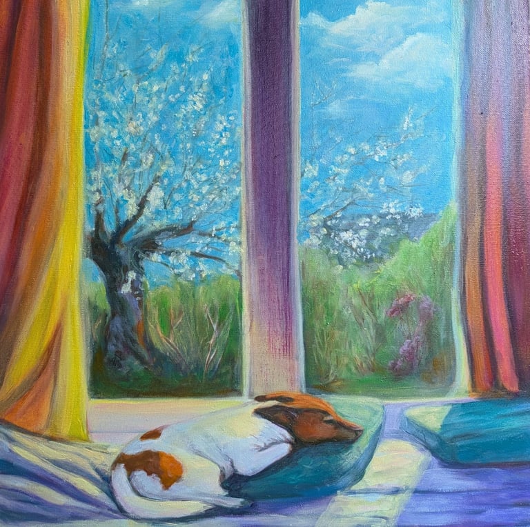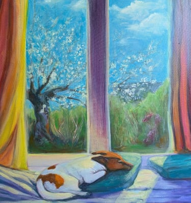 A tranquil afternoon unfolds as sunlight filters through colorful curtains, casting gentle hues on the scene. A dog rests peacefully on soft cushions, surrounded by a medley of colors that enhance the serenity. Beyond the window, an array of spring blossoms beckons attention to the lush garden, where the blossoming trees suggest renewal and growth.