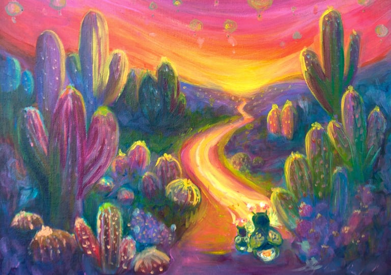 I chose this subject and style to evoke optimism and wonder. The vivid hues and surreal landscape invite viewers to shed the mundane, embracing a world where colors sing and every sunrise promises delightful possibilities. It's an invitation to see reality through the brightest, most hopeful lens, inspiring new adventures and an appreciation for the subtle magic around us. This piece is a pure expression of fantasy, aiming to transport and uplift.