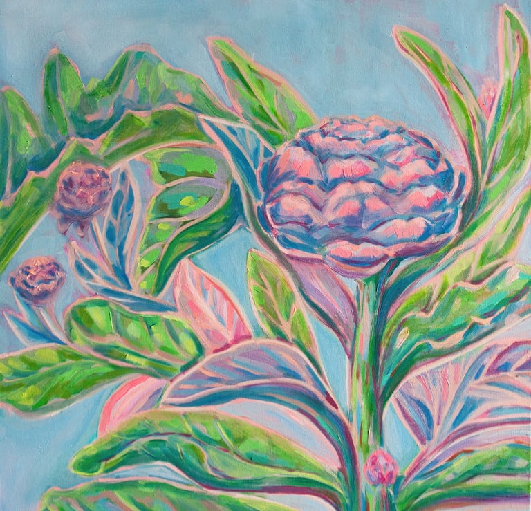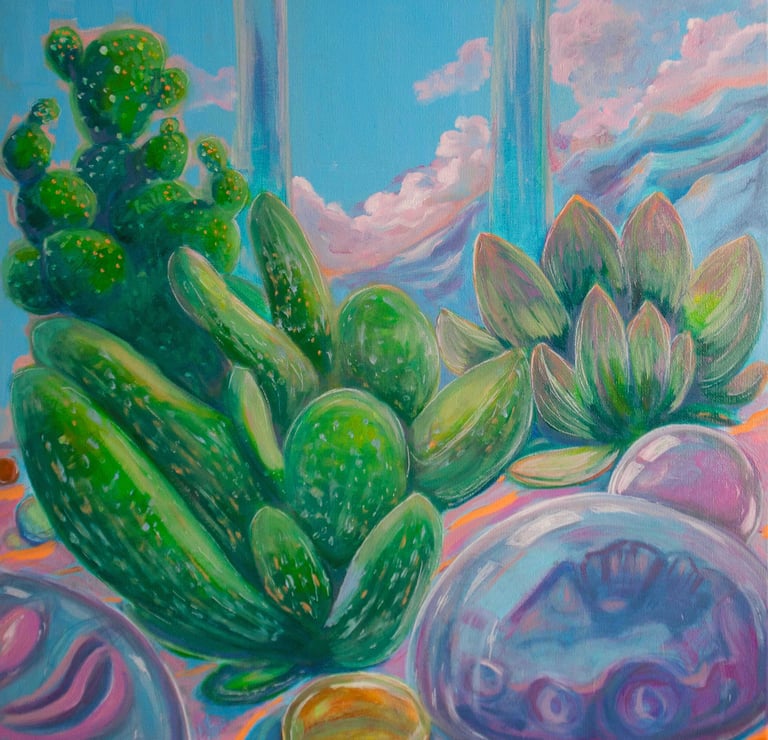 "Marbles and Living Stones" invites viewers into a serene world where the echoes of childhood tranquility gently resonate. This painting captures the quiet wonder of youthful discovery, blending the smooth, polished allure of childhood marbles with the subtle, enduring charm of "living stones," or Lithops. Each rounded form, whether a vibrant glass orb or a camouflaged succulent, rests in harmony, evoking memories of sun-drenched afternoons spent in hushed contemplation.