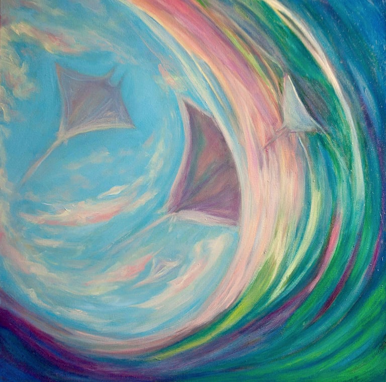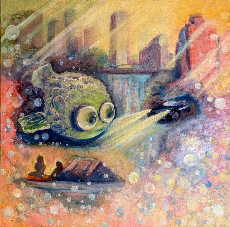My painting is a vibrant journey into childlike joy and boundless imagination.