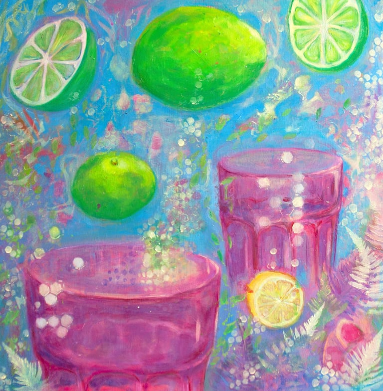 An active still life full of movement in a dazzling fusion of color and form, this narrative presents a lively depiction where limes and glasses coalesce on a textured surface. The combination of vivid lime greens against a backdrop of cerulean blue creates a refreshing immersion. Pinkish hues reflect in translucent glasses, offering a whimsical interaction of light and shade. As patterns of bubbles and delicate ferns arise, the composition hints at a surreal aquatic atmosphere.