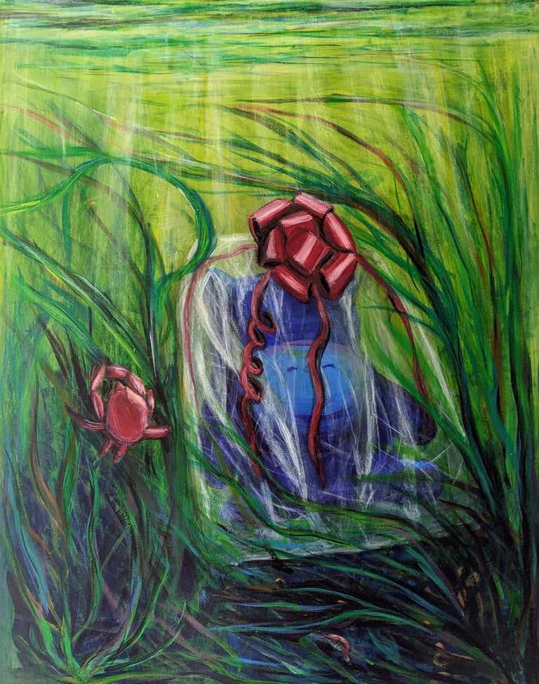 The toy hippo seems both misplaced and oddly at home in this underwater realm, a representation of innocence and vulnerability amidst the currents. The plastic bag, now more than just discarded trash, takes on a paradoxical beauty as it billows gently in the water. The ribbons, once part of a celebratory gift, now cascade like vibrant tendrils, a testament to the strangeness of objects finding themselves in unexpected places.